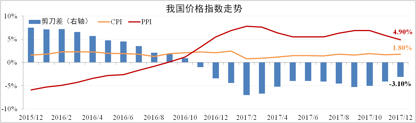 12月我國CPI同比增長1.8%,較上月擴(kuò)大0.1個百分點(diǎn),CPI年度漲幅為1.6%。PPI同比上漲4.9%,較上月下滑0.9個百分點(diǎn),PPI年度漲幅為6.3%。