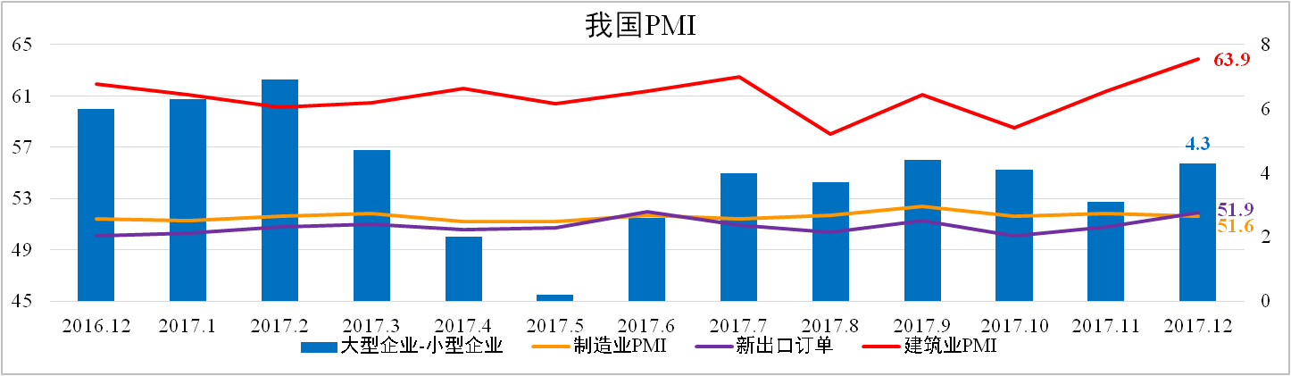 12月我國制造業(yè)PMI為51.6,較上月下滑0.2個百分點(diǎn)。其中,出口訂單繼續(xù)上升至51.9,顯示外需保持強(qiáng)勢;大企業(yè)與小企業(yè)之差有所擴(kuò)大,表明在環(huán)保壓力下大型企業(yè)達(dá)標(biāo)能力強(qiáng);另外,建筑業(yè)意外錄得63.9的高位。