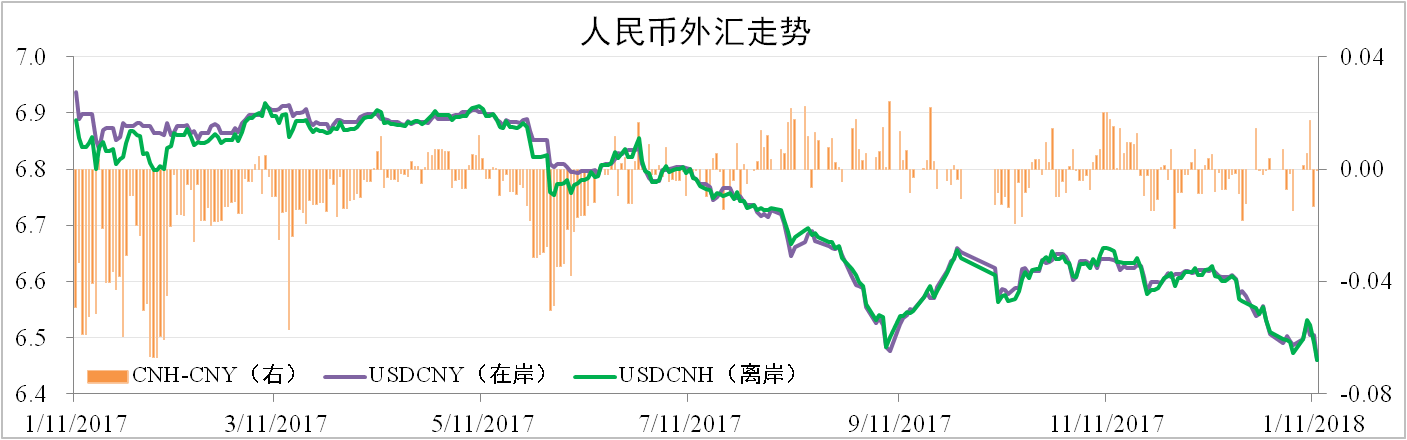 人民幣近期大幅上漲,截止2018年1月12日,在岸人民幣匯率為6.4606,環(huán)比升值2.43%,離岸人民幣匯率為6.4605,環(huán)比升值2.51%。1月9日央行通知部分中間價報價行對逆周期因子進(jìn)行調(diào)整,調(diào)整后相當(dāng)于無逆周期調(diào)節(jié)。